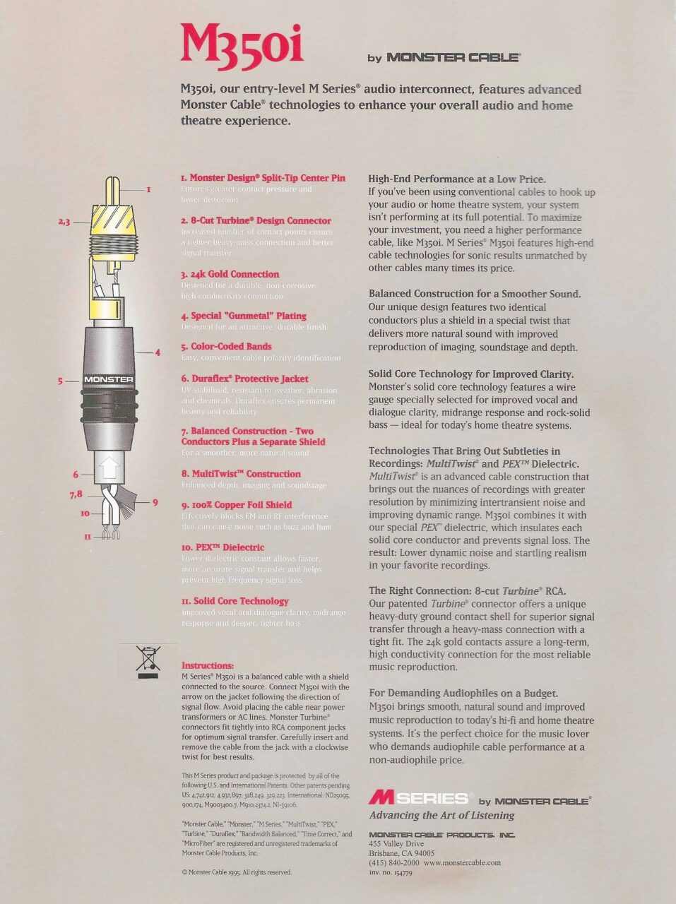 今回紹介するのは米国モンスターケーブルM350i RCAインターコネクトケーブル。国内価格は定価7000円/1mペアと低価格帯の製品になります(注:今更ですけれども、米国での価格は当時の日本国内定価の半額以下でした)。なんで今更こんなディスコンの忘れ去られたケーブルの話をするのかというと、私、このケーブル大好きなんですよね。安いのに、美味しい。そして単線。いま一斉に画面の向こうの単線厨がアップしはじめました!…( ੭ ・ᴗ・ )੭♡・・・あとにも先にもMonster Cable社のRCAケーブルはその殆どが複雑な撚り線構造ですので、単線ケーブルの製品ってのは、なかなかに珍しいのでございます。